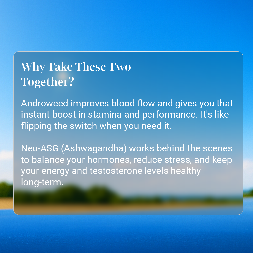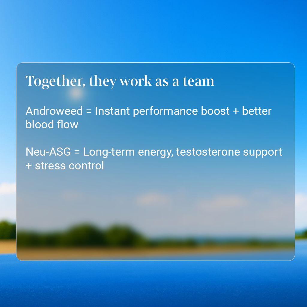 - Neu-ASG (Ashwagandha) helps normalize cortisol and boosts testosterone and energy metabolism, preventing fatigue and performance anxiety.