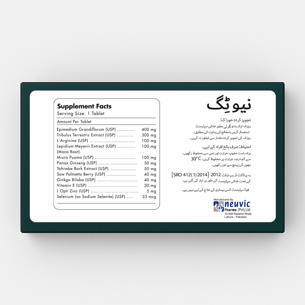 With well-studied ingredients such as Horny Goat Weed, Tribulus, Maca Root, Ginseng, L-Arginine, Yohimbe, Saw Palmetto & Ginkgo Biloba, Neutig is designed to support confidence, endurance, and overall male wellness.