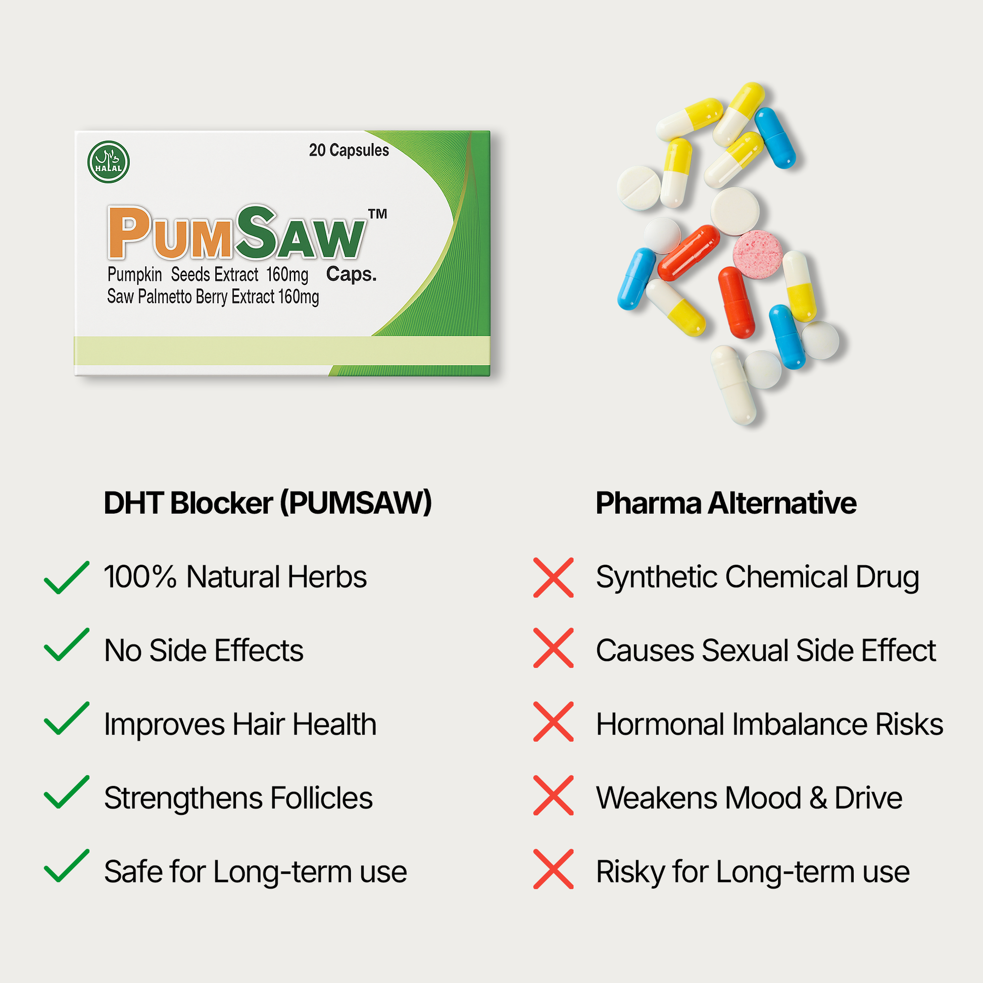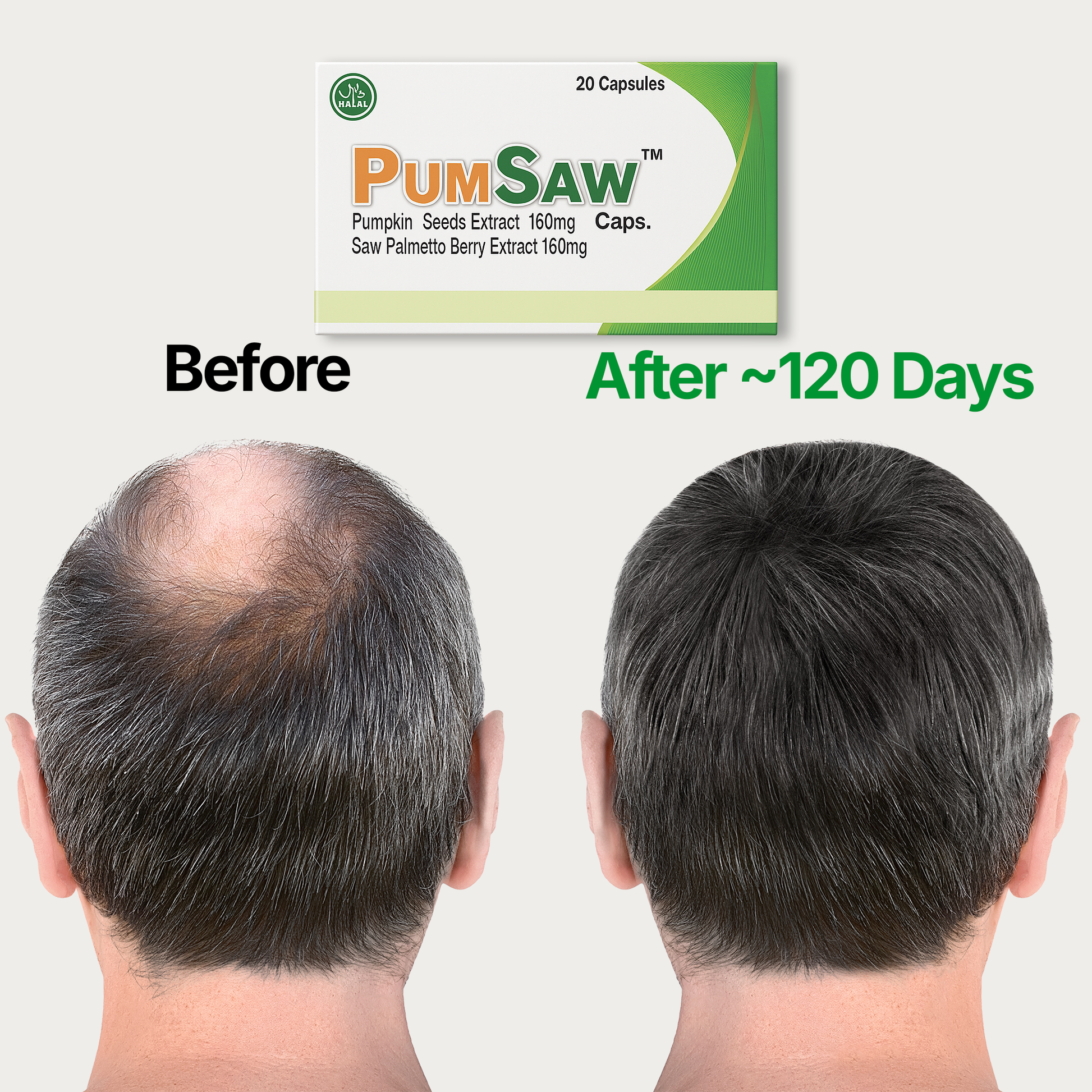 PumSaw™ is a nutritional supplement combining Pumpkin Seed Extract (160 mg) and Saw Palmetto Extract (160 mg) ingredients known for their natural support of hormonal balance, hair retention, and prostate wellness.
